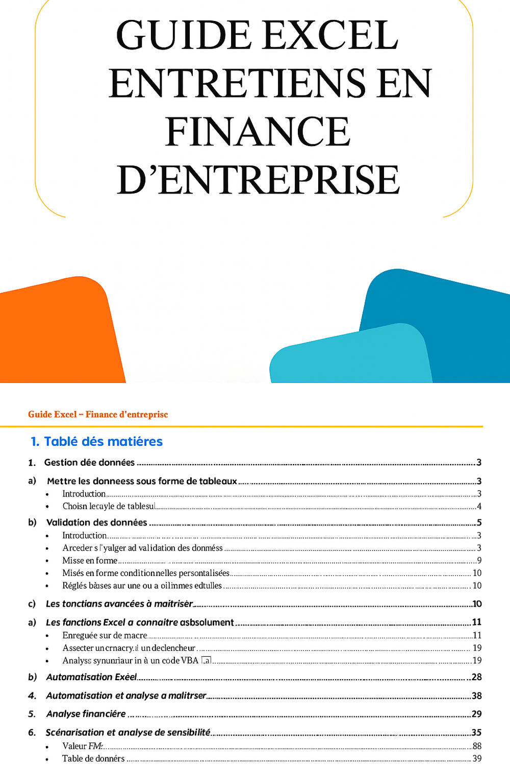 Téléchargez gratuitement le guide “Excel – Entretiens en Finance d’Entreprise” et découvrez, étape par étape, ce qui est vraiment attendu : formules clés, tableaux dynamiques, analyses, automatisations…